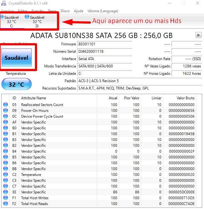 Assim que abrir o CrystalDiskInfo, ele já mostra automaticamente as informações do seu HD ou SSD, se ele esta com defeito ou saúdavel